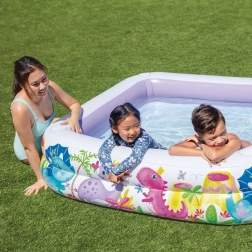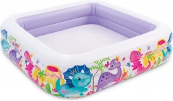 Piscina gonflabilă pentru copii INTEX, cu imprimeu colorat cu dinozauri, este ideală pentru zilele fierbinți. Datorită copertinei gonflabile detașabile, copiii se pot juca în apă la umbră, iar părinții vor aprecia ușurința în utilizare și designul sigur. Dimensiunile 157 × 157 × 122 cm și capacitatea de 295 l oferă suficient spațiu pentru răcorire și joacă.