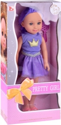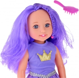 Păpușa este îmbrăcată în rochie violet stilată cu motiv de coroană, evidențiind aspectul său regal.