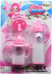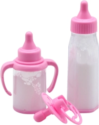 Conține două biberoane diferite și o suzetă într-o nuanță delicată de roz. Perfect pentru jocuri de rol și simulare a îngrijirii păpușilor.