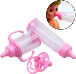 Setul de jucării pentru păpuși este un accesoriu ideal pentru jocurile de familie și îngrijirea copilului. Conține două biberoane și o suzetă, toate în nuanțe delicate de roz. Biberoanele sunt umplute cu un lichid ce imită laptele care dispare când sunt înclinate, creând un efect realist de hrănire.