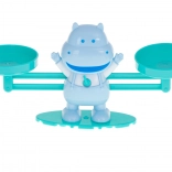 Un cântar stilat cu două brațe și un hipopotam zâmbitor îi învață pe copii bazele echilibrului și cântăririi prin joc.