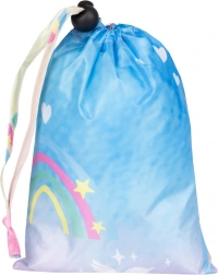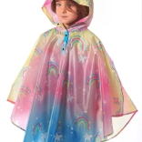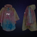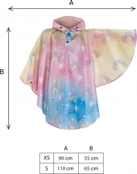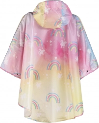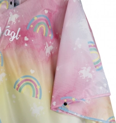 Poncho de ploaie pentru copii, stilat, cu glugă cu cozoroc, într-un design magic cu unicorni și curcubeu. Material impermeabil și ușor, elemente reflectorizante pentru siguranță și croială care se poartă peste rucsac sau ghiozdan fac din această pelerină alegerea ideală pentru școală și excursii. Include un săculeț practic cu șnur asortat ca design.