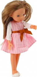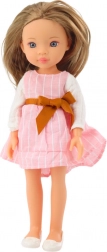 Păpușa emană eleganță datorită rochiei sale roz cu dungi albe, creată pentru mici pasionate ale modei.