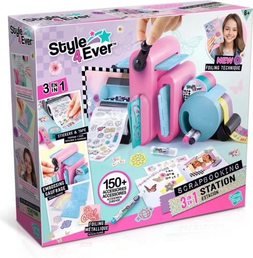 Studio-ul creativ 3‑în‑1 STYLE 4 EVER este un set artistic multifuncțional pentru copii de la 6 ani, care combină trei tehnici îndrăgite – realizarea de autocolante, embossarea și crearea/decorarea benzilor washi. Mașina manuală în culori pastel se manevrează ușor cu ajutorul unei roți rotative și permite crearea de modele în relief, autocolante originale și decor personalizat pentru jurnale.