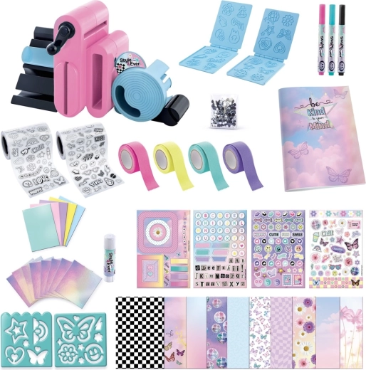 Sunt incluse peste 150 de accesorii: coli de hârtie, autocolante alb-negru și colorate, markere, adezivi cu sclipici, benzi decorative și șabloane tematice cu motive florale, fluturi, stele și inscripții precum „Be Happy” sau „Cool”. În pachet găsești și un mic carnețel pentru utilizarea imediată a noilor decorațiuni create.
