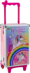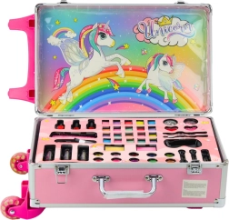 Acest set bogat de cosmetice pentru copii este depozitat într-un troller robust cu motiv unicorn, care cucerește de la prima vedere. Datorită mânerului telescopic și roților, copilul îl poate lua ușor oriunde – în vizită, în vacanță sau prin casă. Toate produsele incluse sunt blânde cu pielea delicată a copiilor și ușor de îndepărtat, astfel încât se poate juca fără griji.