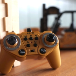 Telecomanda avansată permite control complet asupra stivuitorului, inclusiv mers înapoi și virare.