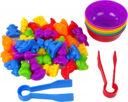 Acest set Montessori colorat aduce o formă simplă, dar foarte eficientă, de învățare. Copiii răstoarnă figurinele pe masă și, cu ajutorul cleștișorilor, le atribuie bolurilor după culoare, dezvoltând coordonarea mână–ochi, concentrarea și gândirea logică. Figurinele din cauciuc sunt plăcute la atingere și sigure pentru mâinile mici ale copiilor.