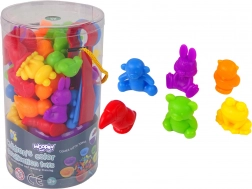 Jocul educațional WOOPIE tip sorter Montessori al culorilor cu animăluțe oferă învățare prin joc – copiii, cu ajutorul pensulețelor/cleștișorilor, sortează figurinele din cauciuc în boluri colorate, exersând culorile, număratul și motricitatea fină. Ideal pentru 1–2 copii cu vârsta de de la 3 ani.