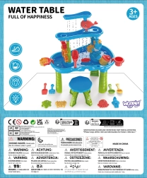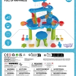 Conținutul pachetului: 2× găletușă, 1× stropitoare, 5× forme, 1× moară simplă, 5× unelte pentru nisip (de ex. lopățică, greblă, sită), masă pentru apă/nisip cu accesorii de montaj, 1× scăunel.