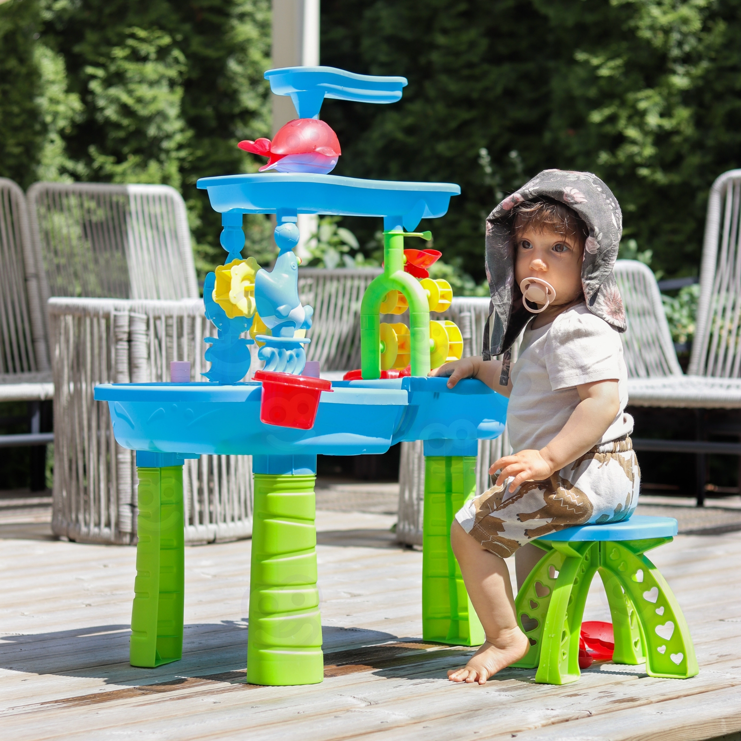 Descoperiți lumea distractivă a măsuței cu apă și nisip WOOPIE, care combină atracțiile acvatice interactive cu joaca creativă cu nisip. Turnați apă în rezervorul superior, urmăriți cascada care curge în cada de jos și puneți în mișcare moara de apă. Datorită accesoriilor bogate, copiii pot lua, cerne, modela și experimenta cu fluxul de apă și nisip – distracție excelentă în grădină, pe terasă sau în camera copilului.