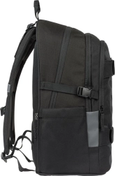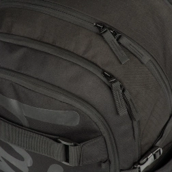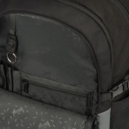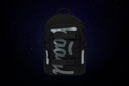 Materialul exterior este reciclat și impermeabil, astfel încât rucsacul face față cu brio vremii schimbătoare. Pentru siguranță, elementele reflectorizante asigură vizibilitate sporită în amurg și întuneric. Nu lipsesc buzunarele laterale din material robust pentru sticla de apă, fermoarele rezistente YKK și curelele frontale pentru prinderea skateboardului. Rucsacul poate fi asortat cu penar, săculeț pentru încălțăminte și alte accesorii în același design; este inclus și un breloc stilat.