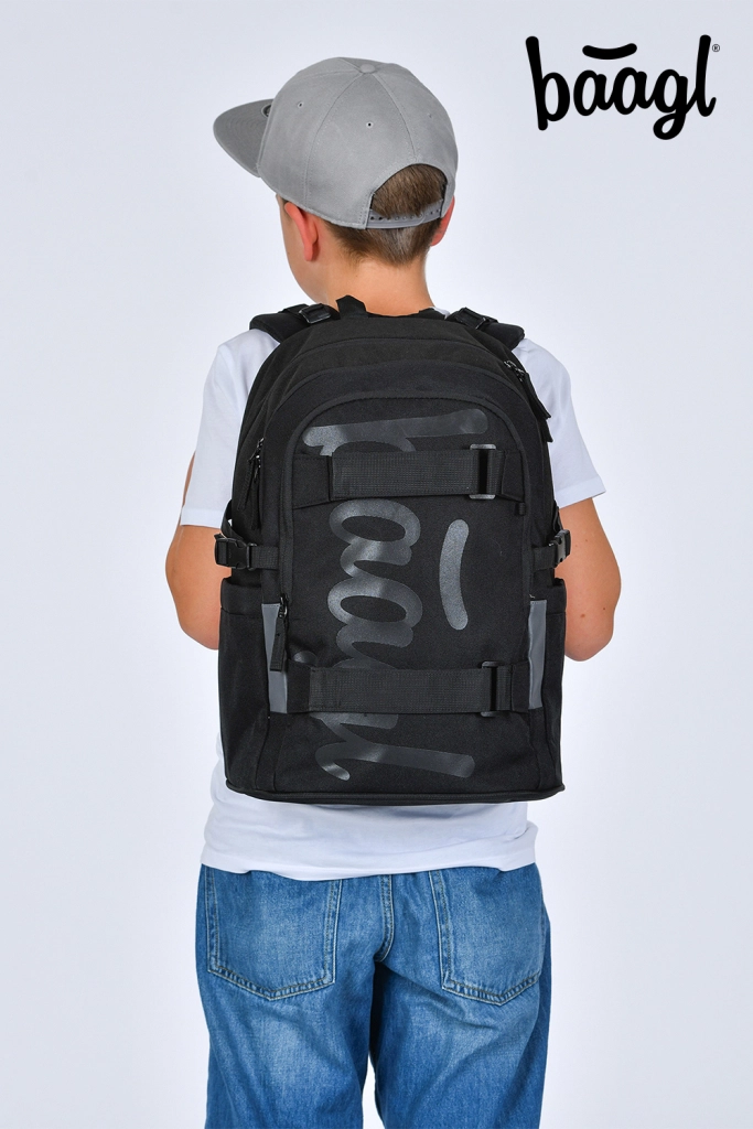 Rucsacul școlar BAAGL Skate Uni, ușor și rezistent, în culoare neagră elegantă, este ideal pentru elevii de la clasa a treia în sus. Oferă spate cu formă anatomică, 3 compartimente spațioase, buzunar căptușit pentru laptop de 15" și curele practice pentru prinderea skateboardului. Fabricat din material reciclat, impermeabil cu elemente reflectorizante pentru siguranță maximă și fermoare fiabile YKK.