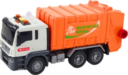 Camionul de gunoi portocaliu la scara 1:14 îi va încânta pe toți micii fani ai vehiculelor speciale. Datorită efectelor luminoase și sonore, clapetei spate rabatabile și celor două coșuri, oferă un joc realist și, în același timp, sprijină învățarea reciclării. Execuția de calitate din plastic și bateriile incluse în pachet asigură distracție imediată și sigură.