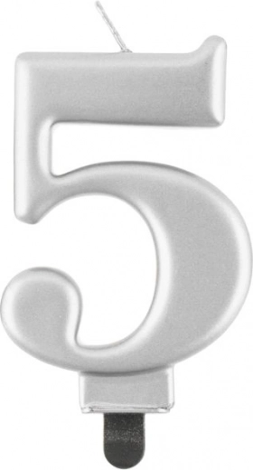 Elegantă lumânare pentru tort în forma cifrei 5 care va îmbogăți orice tort aniversar. Este ideală pentru sărbători de zi de naștere, aniversări și alte ocazii speciale. Finisajul său argintiu oferă tortului tău o notă de lux.