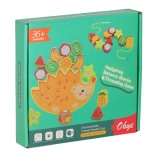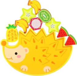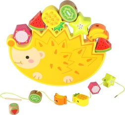 Drăgălașul arici din lemn cu cuburi colorate în formă de fructe oferă două jocuri într-unul: înșirarea fructelor pe șnur și stivuirea de echilibru pe spatele ariciului. Susține motricitatea fină, gândirea logică și coordonarea mână–ochi. Lemnul de calitate, finisat fin și culorile intense invită la joacă îndelungată și plină de sens.