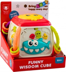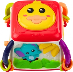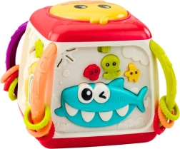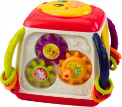 Cubul conține elemente interactive, cum ar fi butoane muzicale și roți dințate rotative, care oferă copilului ore de distracție și stimulare.