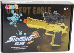 Ambalaj cadou stilat, cu grafică dinamică, evidențiază posibilitățile pistolului: tragere cu bile cu gel și cu săgeți moi – o idee excelentă de cadou.
