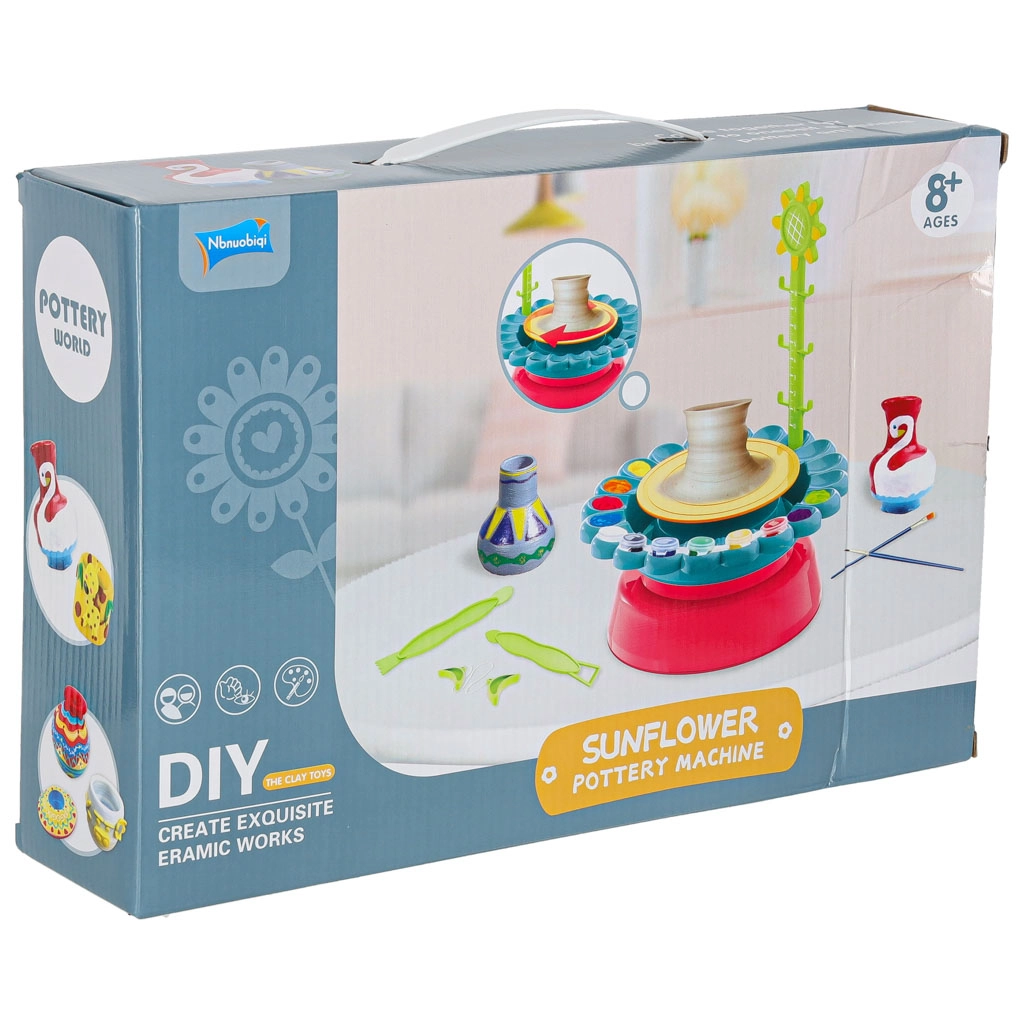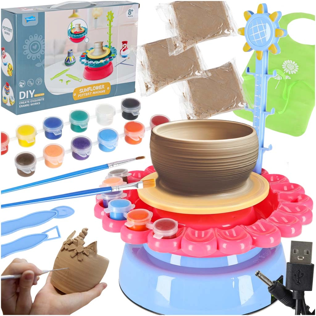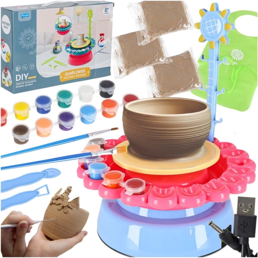 - Set complet: roată, lut, culori, pensule, unelte, cablu USB și șorț