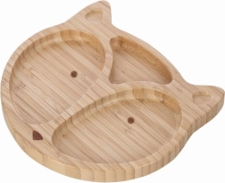 Această farfurioară din bambus fermecătoare este concepută pentru a facilita hrănirea copiilor mici. Datorită ventuzei speciale pe partea inferioară, farfuria se fixează ferm pe masă și previne răsturnarea acesteia. Trei compartimente permit împărțirea alimentelor în porții și mențin ordinea alimentației.