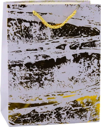 Această geantă cadou elegantă și atemporală în nuanțe argintii cu un design auriu neregulat este un ambalaj stilat, care atrage atenția și subliniază caracterul unic al cadoului. Accentele aurii strălucesc frumos sub lumină, oferind genții un aspect luxos și modern, care cu siguranță va atrage persoana care primește cadoul.