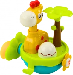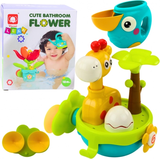 Setul conține o girafă drăguță cu părți mobile, un palmier colorat, flori și rotoare de apă colorate. Include și un pahar practic cu cioc, cu care jucăria poate fi udată. Când copilul toarnă apă pe locurile destinate, jucăria prinde viață - piesele încep să se rotească, florile să se miște și apa să curgă, ceea ce atrage atenția și aduce multă bucurie.
