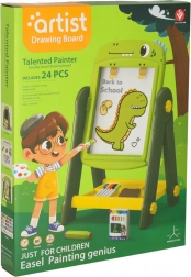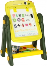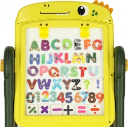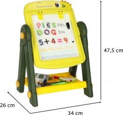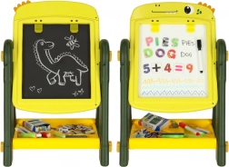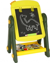 Această tablă educațională cu două fețe este un instrument ideal pentru dezvoltarea creativității și a învățării la copii. Pe o parte se află o suprafață albă magnetică, care permite desen și scriere cu markere pentru șters la uscat, în timp ce cealaltă parte servește drept tablă neagră clasică pentru desenat cu cretă. Împodobită cu un motiv vesel cu dinozauri, această tablă va fermeca orice copil prin culorile și posibilitățile sale de utilizare.