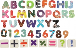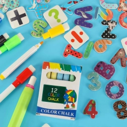 Include diverse materiale educaționale precum litere și cifre magnetice, cretă și markere.