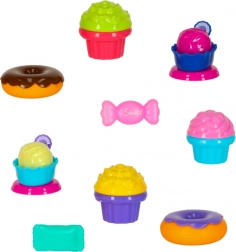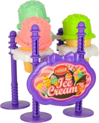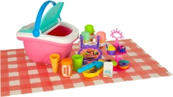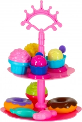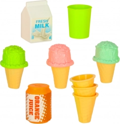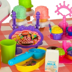 Conținutul pachetului include jucării precum înghețate, gogoși, deserturi, lapte, suc, pahare, dulciuri și chiar o linguriță pentru înghețată. Veți găsi de asemenea un platou, tavă, suport pentru înghețată și o comodă mușama din plastic.