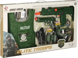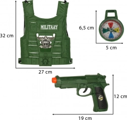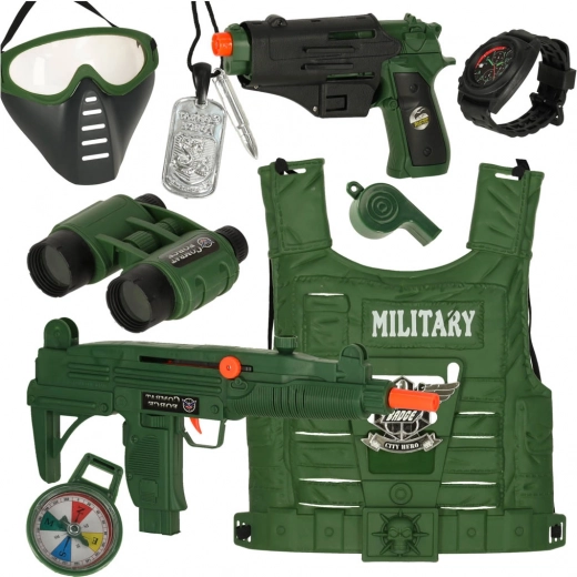 Acest set militar este ideal pentru toți micii iubitori de aventură și jocuri militare. Cu acest set, copiii pot trăi misiuni palpitante și aventuri. Conține: vestă, binoclu, pușcă cu încărcare mecanică, pistol pe baterii, ceas din silicon, mască pentru ochi, busolă, fluier real, placă de identificare militară și toc pentru pistol. Fiecare element este realizat din materiale de calitate și oferă detalii realiste.