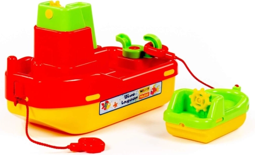 Remorcherul este echipat cu un cârlig și o frânghie, datorită cărora copiii pot cu ușurință conecta și tracta bărcuța mai mică – exact ca pe apă adevărată.