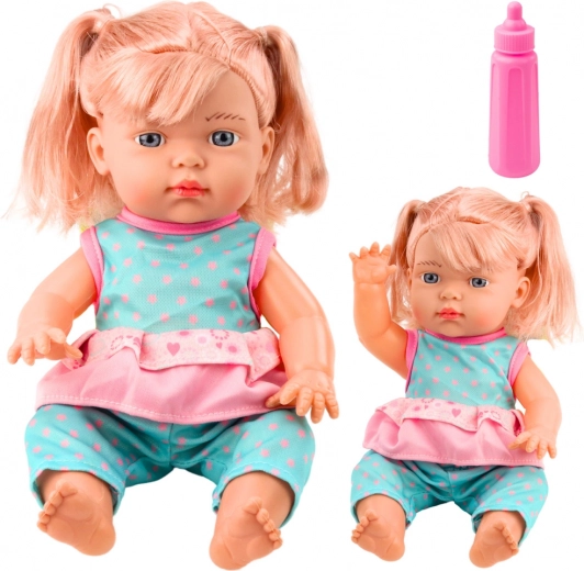 Păpușa este îmbrăcată într-un costum unic, detașabil, de culoare turcoaz cu puncte roz și volan. Setul include și un biberon, grație căruia copiii pot juca scene de hrănire și îngrijire.