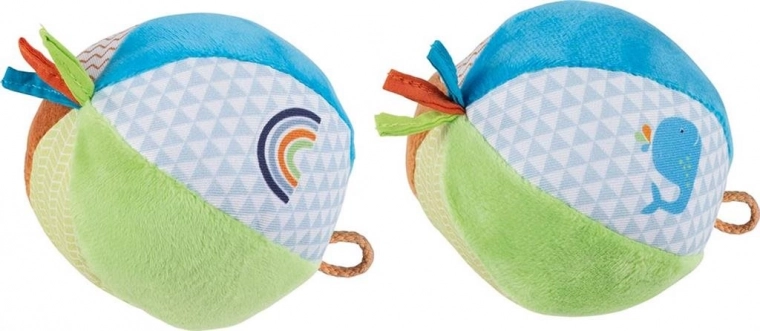 Jucăria este de asemenea realizată din material textil, cu umplutură moale la interior, ceea ce contribuie la un joc sigur și plăcut. Diametrul său este de aproximativ 8,5 cm și se recomandă spălarea manuală la 30°.