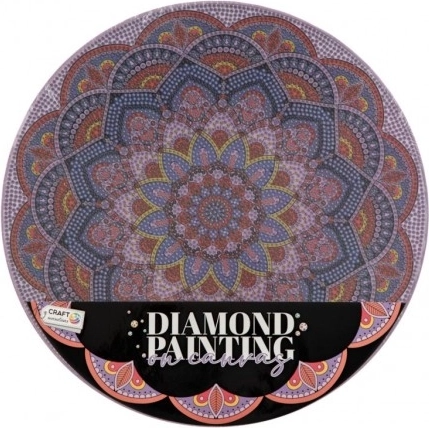 Descoperiți farmecul picturii cu diamante cu designul nostru mov de mandala pe un pânză rotundă cu diametrul de 30 cm.