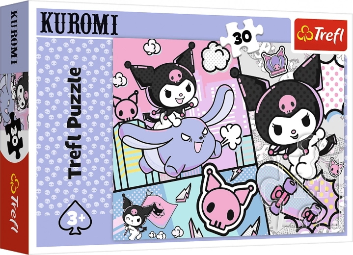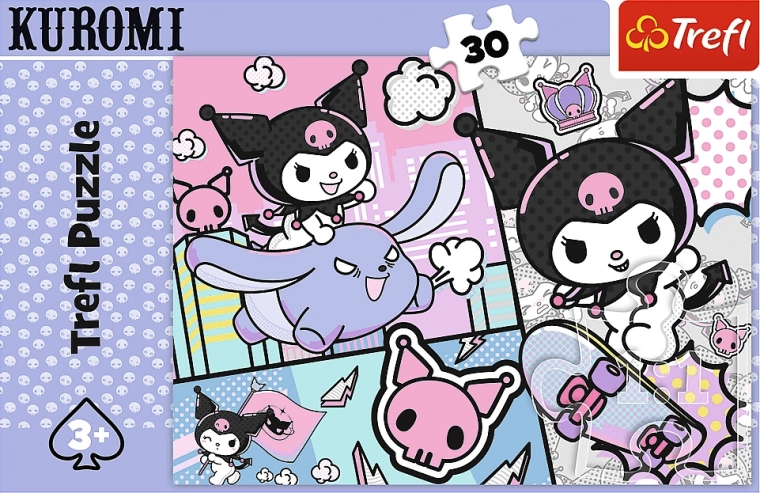 Puzzle KUROMI cu 30 de piese. Dimensiune după asamblare 27 × 20 cm, motiv drăguț, ideal pentru copii și începători. Cadou grozav pentru distracție rapidă.