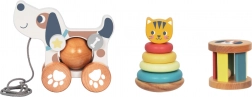 Set motoric distractiv pentru copii cu vârsta de la 1 an. Conține trei jucării pentru dezvoltarea motricității fine și a coordonării, fabricate din lemn certificat FSC®.