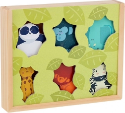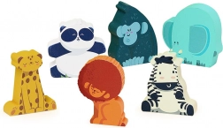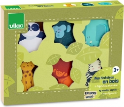Figurinele din lemn sunt robuste, ideale pentru mâinile copiilor și oferă distracție fără ecrane, cu accent pe descoperirea de sine. Figurinele sunt păstrate într-o cutie frumoasă din lemn cu motive naturale și vedere spre junglă, aducând o bucată de sălbăticie direct în camera copilului. Setul include: 6 figurine – leu, panda, gorilă, elefant, zebră și panteră.
