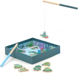Conținutul pachetului include 12 broscuțe din lemn cu magnet, 2 bețe din lemn cu magnet și 1 cutie de joc/bază. Acest joc poate fi jucat de la vârsta de 2 ani și este ideal pentru 2 jucători.