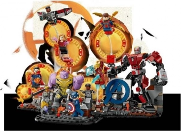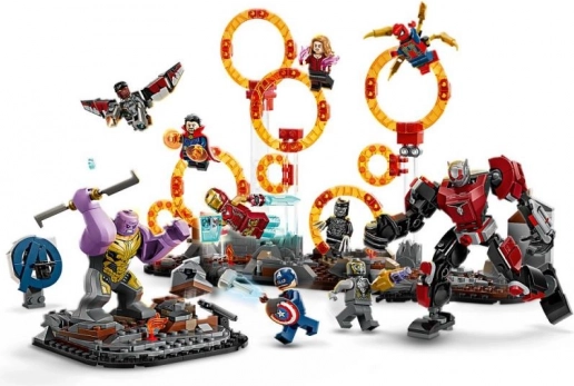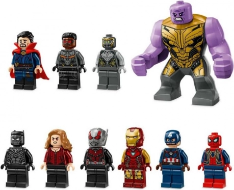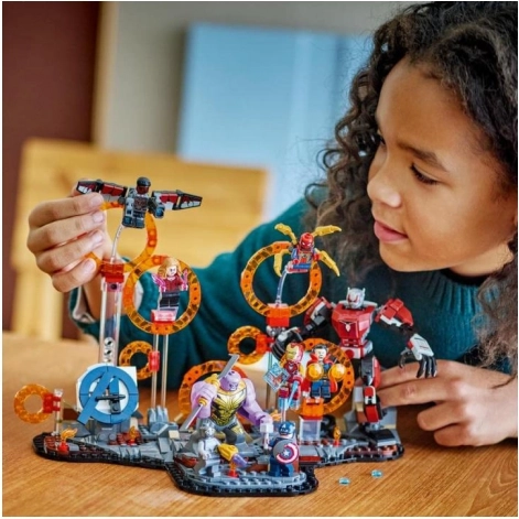 Retrăiți bătălia finală din filmul MARVEL Studios Avengers: Endgame. Setul include nouă minifigurine – Căpitanul America (cu scut), IRON MAN MK85 (cu sabie și scut), CHITAURI (cu tun de umăr), ANT-MAN, SCARLET WITCH (cu elemente de efect), DOCTOR STRANGE, IRON SPIDER (cu 4 membre articulabile pe spate), BLACK PANTHER și FALCON (cu doi lansatoare) – plus o figurină mare THANOS și mecha complet articulat al lui Ant-Man.