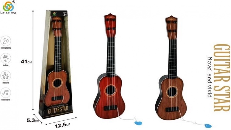 Această chitară pentru copii este un instrument excelent pentru dezvoltarea abilităților muzicale la copii. Cu o lungime de 36 cm, este ușor de prins și adaptată mâinilor mici.