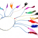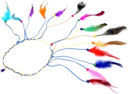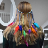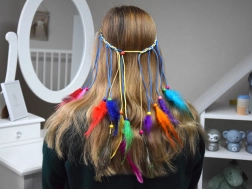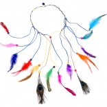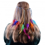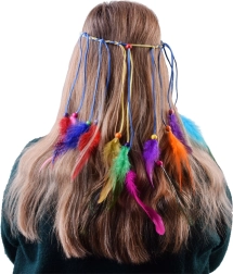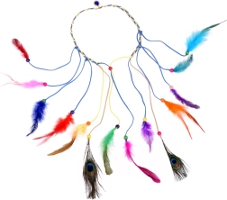 Îmbunătățește-ți stilul cu această bentiță pentru păr, într-un mod colorat. Este fabricată din pene ușoare, colorate în nuanțe intense - de la turcoaz și galben la roșu și verde. Combinarea cu mărgele mici, din lemn și împletituri subțiri creează un efect natural și de impact.