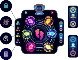 Acest covor este conceput pentru distracție atât pentru copii, cât și pentru adulți care doresc să-și arate abilitățile de dans. Designul atrăgător în culori închise va capta atenția tuturor. Este potrivit pentru antrenarea coordonării, reflexelor și a condiției fizice.