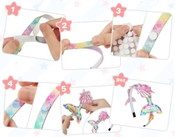Setul de creativitate Sirenă îndeplinește visul fiecărei fetițe mici. Conține tot ce este necesar pentru a realiza o bentiță personală, inclusiv 6 bentițe în culori pastelate, decorațiuni precum panglici strălucitoare, cozi, cochilii, stele, inimioare, fundite, coroană și sirene. Totul este prevăzut cu autocolante care nu necesită utilizarea lipiciului sau foarfecelor. Sigur și simplu pentru copiii mici.