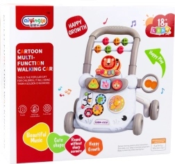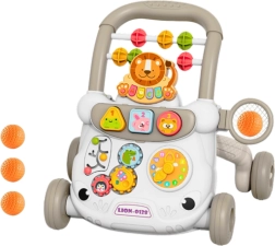 Mersul are un design colorat cu motive de animale precum leul și iepurele, care atrage atenția copiilor și îi încurajează să fie activi. Construcția robustă asigură siguranța, în timp ce baza largă și cele patru roți durabile cresc stabilitatea. Mânerul special ajută atunci când copilul învață să meargă. Funcțiile sonore incorporate și jucăriile mecanice dezvoltă coordonarea și simțurile auzului și tactilului.