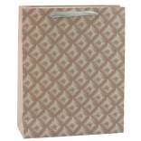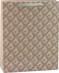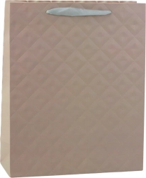Această pungă cadou este realizată din hârtie de calitate superioară, întărită. Suprafața este decorată cu relief geometric, care reflectă frumos lumina. Conține mânere din satin într-o nuanță delicată, care asigură transportul comod și conferă pungi un caracter delicat.