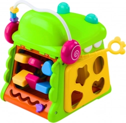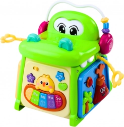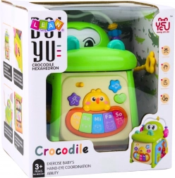 Cubul interactiv crocodil este echipat cu un pian cu clape colorate „Do, Re, Mi, Fa, Sol”, componente mobile pentru manipulare și un ceas cu arătătoare mobile. Fiecare parte a cubului oferă activități diferite, menținând interesul copilului pentru o durată mai lungă. Marginile rotunjite și componentele mari fac jucăria sigură și sprijină dezvoltarea abilităților manuale.