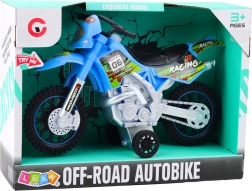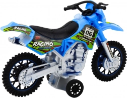 Această motocicletă este fabricată din plastic rezistent, care suportă jocul intens. Designul albastru atrăgător cu autocolante de curse și roți mari în stil off-road oferă stabilitate excelentă și experiențe realiste de condus pe teren accidentat.