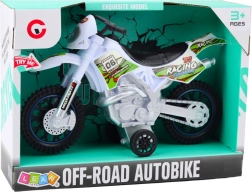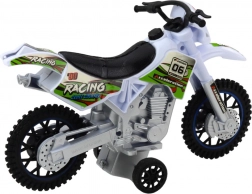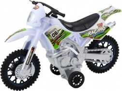 Acest model de motocross este fabricat din plastic durabil, care rezistă jocului intensiv. Designul alb-verde cu autocolante de curse arată foarte atrăgător. Roțile mari off-road asigură stabilitate și o mai bună simulare a mersului pe suprafețe denivelate.
