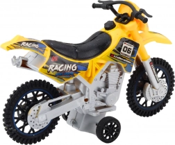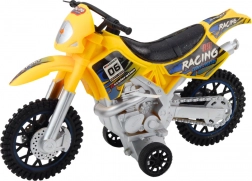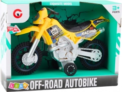 Această motocicletă este fabricată din plastic durabil, care suportă jocurile intense. Culoarea galbenă și autocolantele de cursă îi conferă un aspect atractiv, în timp ce roțile mari de teren oferă stabilitate pe suprafețele neregulate.
