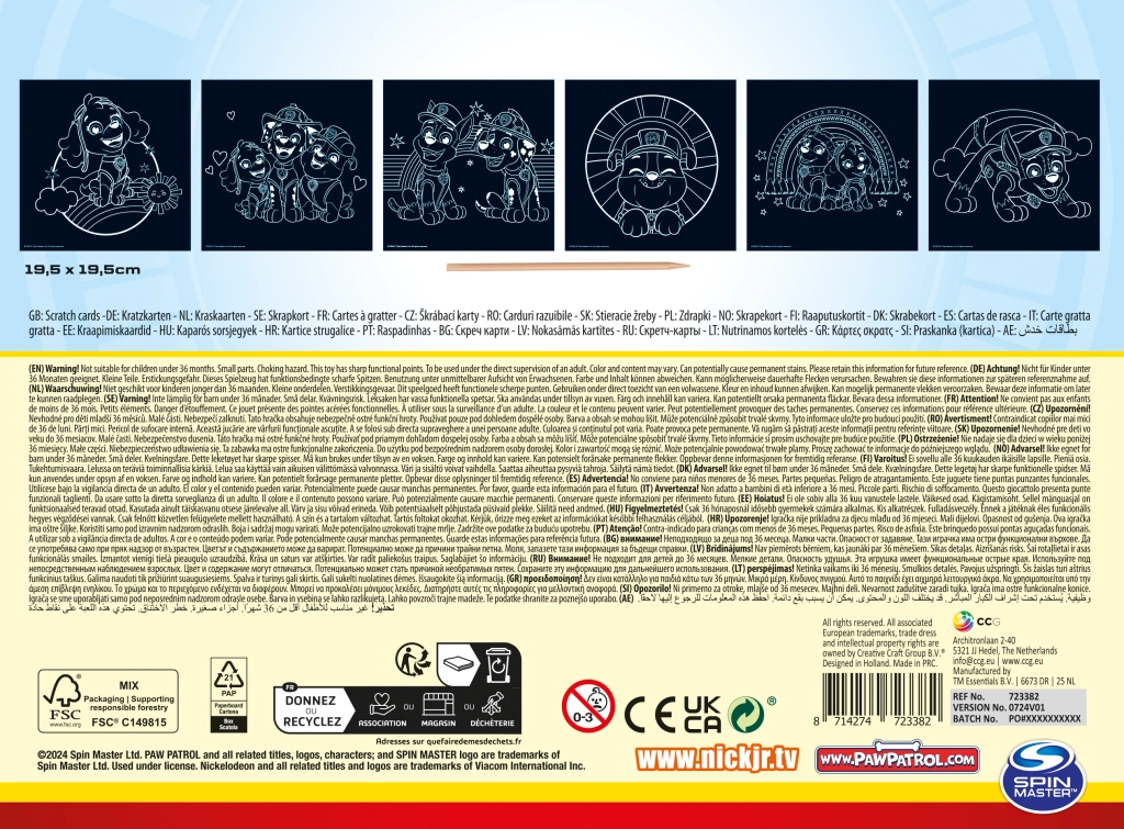 Descoperă magia creației cu imaginile de răzuit inspirate de serialul Paw Patrol. Cu ajutorul unui stilou special îndepărtezi ușor stratul negru și dezvălui modele colorate cu personajele preferate. O activitate grozavă pentru copii, care dezvoltă creativitatea, motricitatea fină și răbdarea. Pachetul conține 6 imagini și un stilou de răzuit; dimensiunea unei imagini este de 19,5 × 19,5 cm.